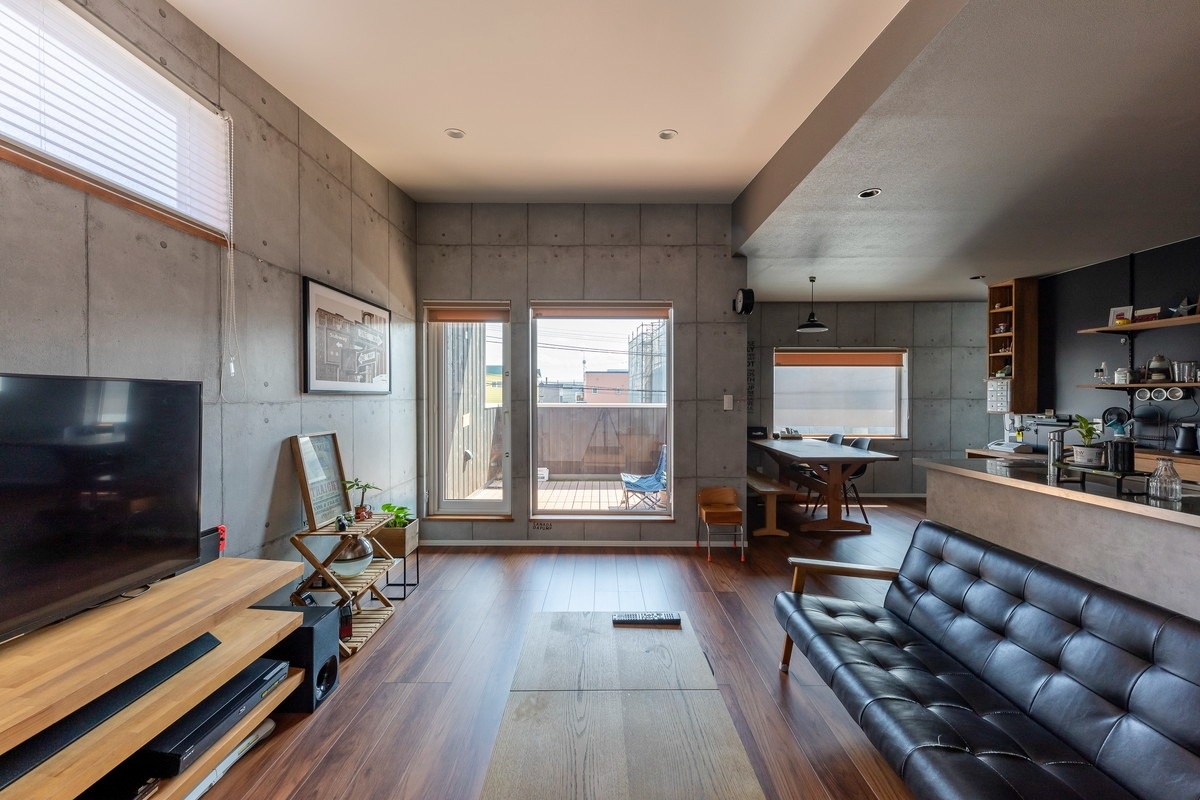 ソファに座るとこんな感じ。壁のタイルもいい雰囲気です。この左手に、浴室、洗面室、寝室が配置されています。