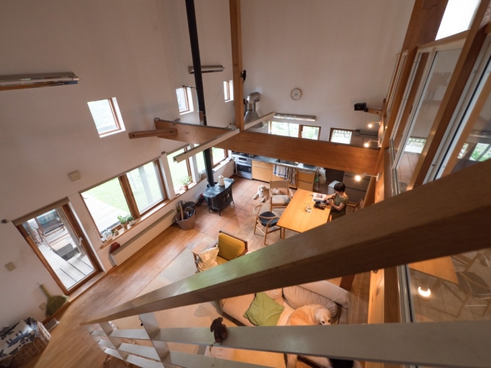 藤井さん「吹き抜け空間を作るメリットは、開放感だけでなく、子育て世代で家族の様子をリビングに居ながら感じることができる、リビングにある薪ストーブ1台で2階の個室も含めて暖かくできる点もあります」