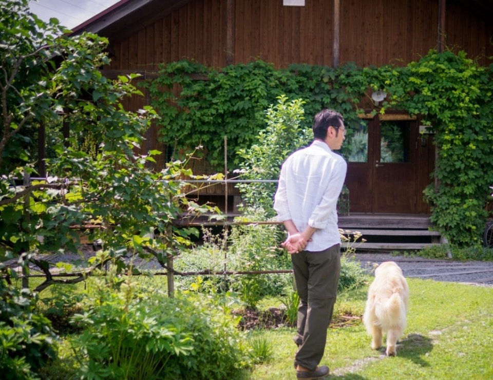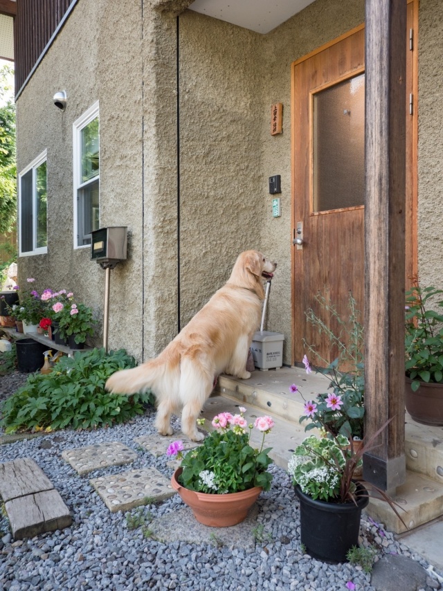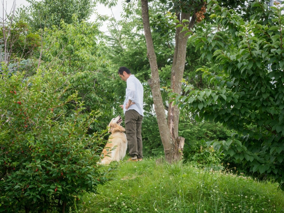 そこで、ご自宅と事務所にお邪魔しました。 旭川駅から約12キロ。東神楽町に藤井工務店の事務所と自宅、ご両親の住む家がありました。 さっそく藤井さんと、「ずんぐり」「むっくり」という2匹のゴールデンレトリバーがお出迎え。緑豊かな庭の奥には、三角屋根の事務所が見えています。