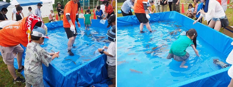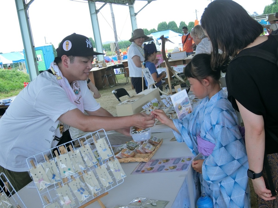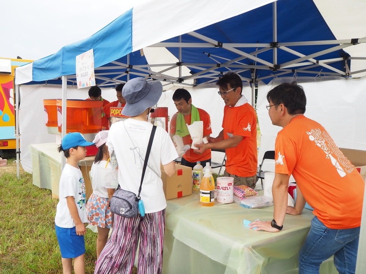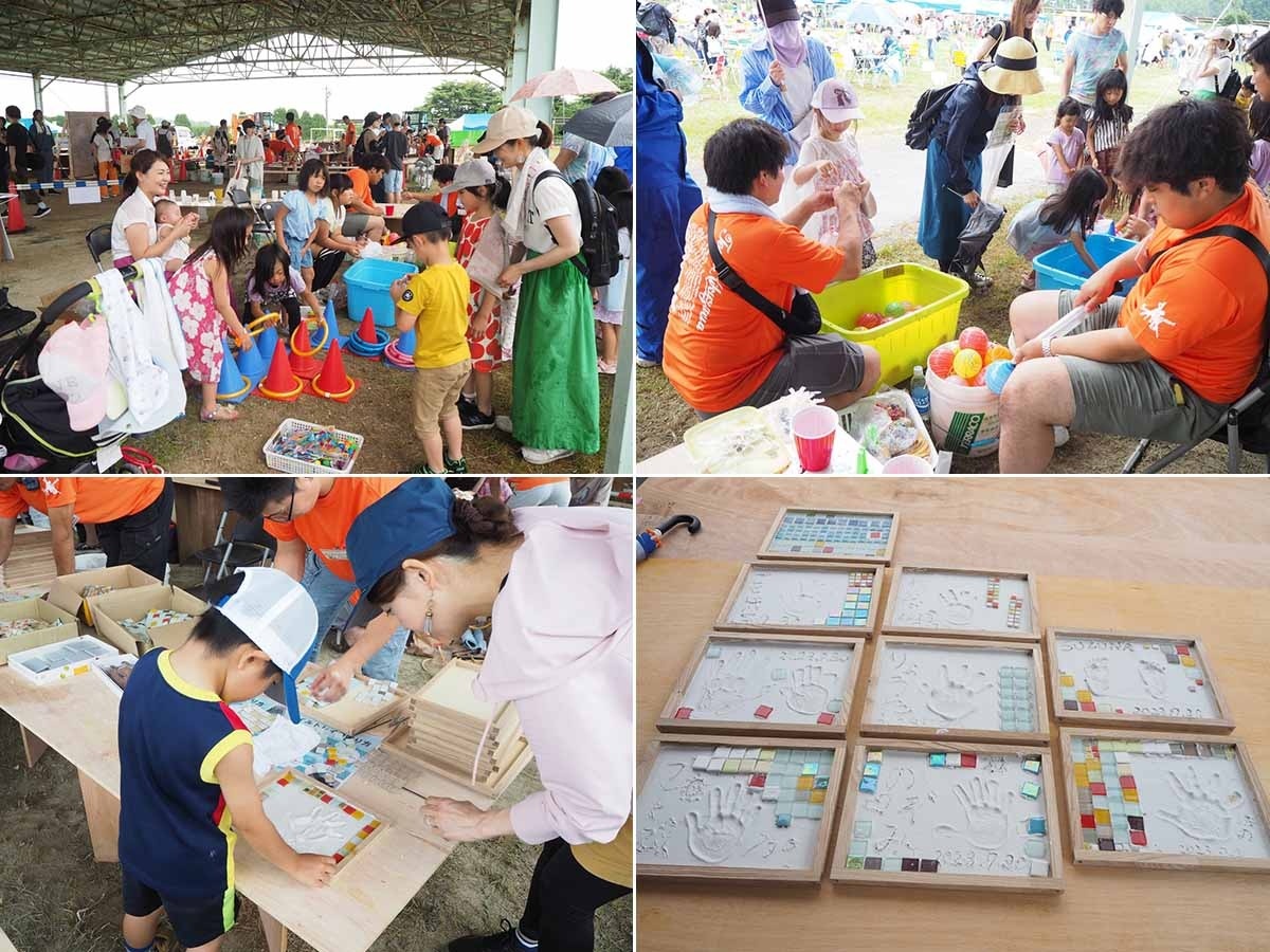 大きな屋根下の会場では、キクザワ恵風会が主催するワークショップや縁日が人気です。タイルトレイや手形アート、サイコロカレンダーなどの木工小物も作れます。このワークショップは、4月に入社した新入社員の2名がメインで企画し、準備を進めてきたコーナーなのだそう。夢中になって参加する子どもたち。自由研究にもピッタリですね。