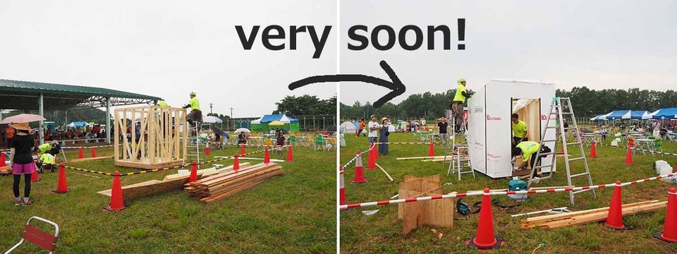 会場の中央では建て方ショーが行われています。あっという間に建ちあがっていく様子に圧倒されます。キクザワの職人の技と、チームワークの良さを見ることができました。