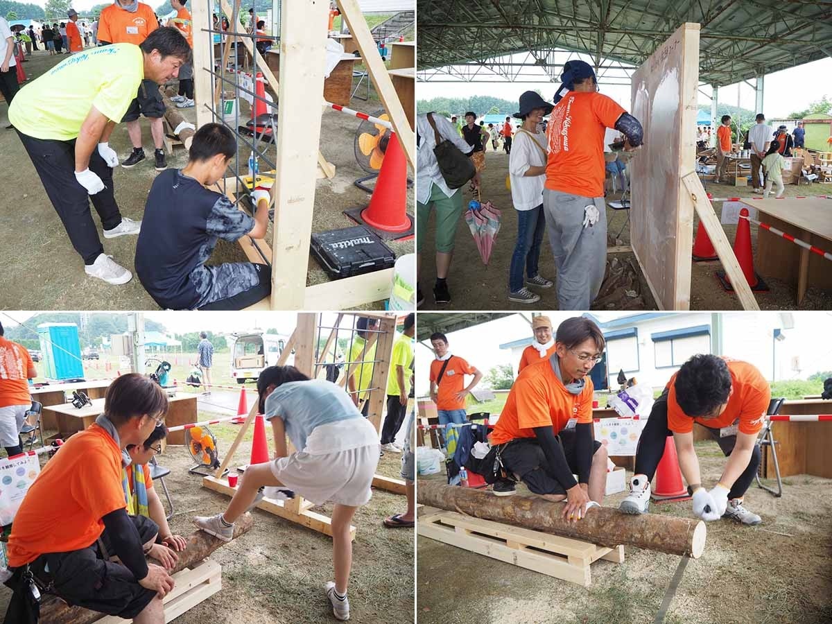 こちらは丸太切り、鉄筋結束、塗り壁などが体験できるコーナー。スタッフが丁寧に付き添って道具の使い方を教えてくれます。