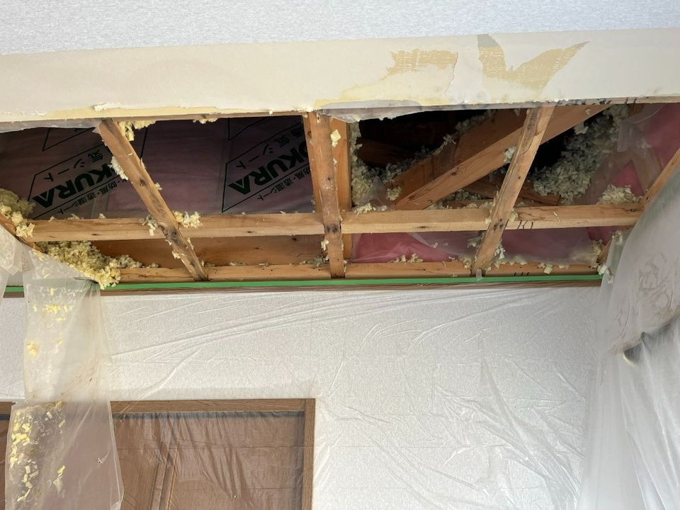 また、天井を剥がすと、屋根裏に雨水が染み込んでいた跡が確認できました。