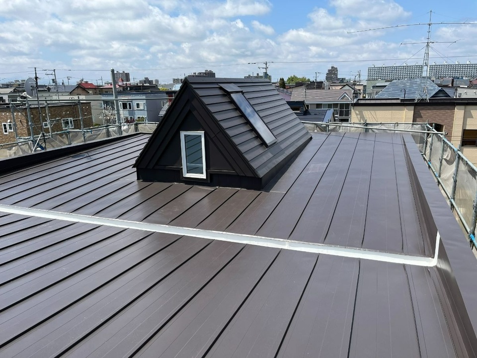その後、新しい鉄板に張り替えて完了。さらに、屋根補修で組んだ足場を活用することで、2、3年後に行う予定だった外壁の塗装も前倒しで実施し、足場を組むコストを削減しました。約1カ月半かけて、外回りのメンテナンスを一度に終わらせることができました。