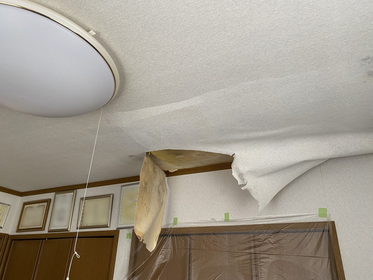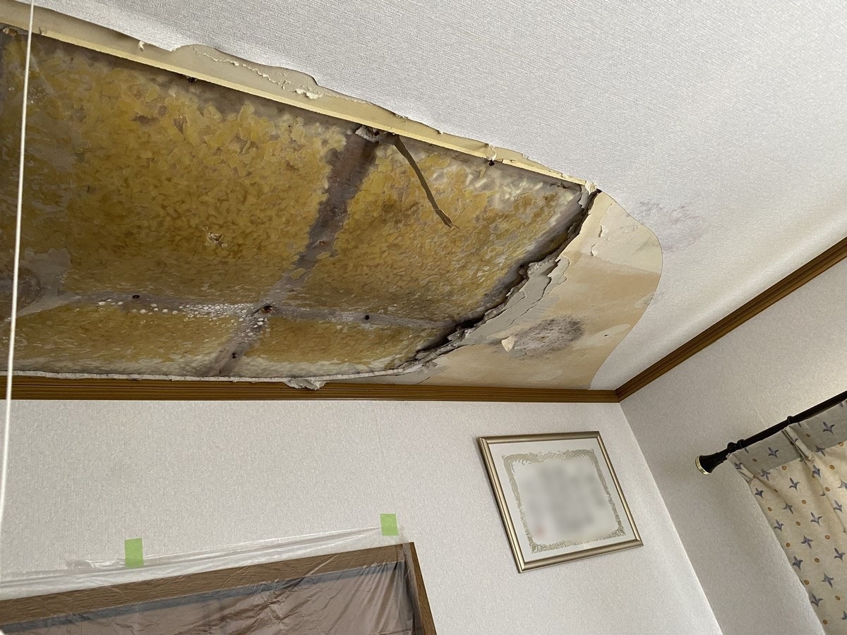 建匠の山口征貴部長の見立てでは、「継ぎ目のコーキングが経年劣化したことが原因では?」とのこと。さらに、2022年の7月後半に降った大雨で一気に雨水が天井裏に入り込み、これまで少しずつ雨漏りによって傷んでいた箇所に重さが加わり耐えきれなくなった壁紙や石膏ボードが落ちてしまったと見られます。
