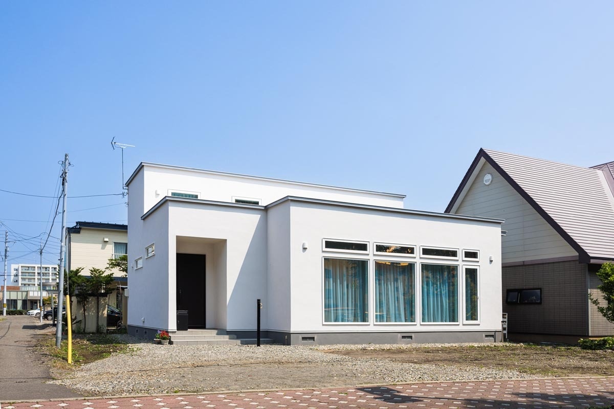 外観は内装の雰囲気と合わせ、白の塗り壁とシルバーの屋根で仕上げました。