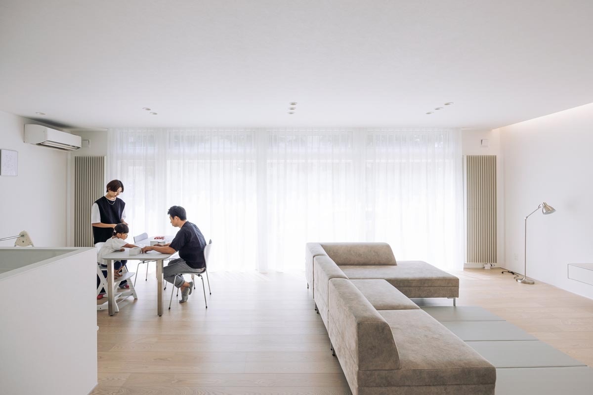 LDKはRC造のタワーマンションのような大空間を希望していたSさん。南面は全面窓にして見晴らしを確保しました。さらにLDKの部分は2階を作らないプランにすることで、30帖の空間の中に柱を設置せず、天井高も2.7mという開放感あふれる空間を実現しています。
