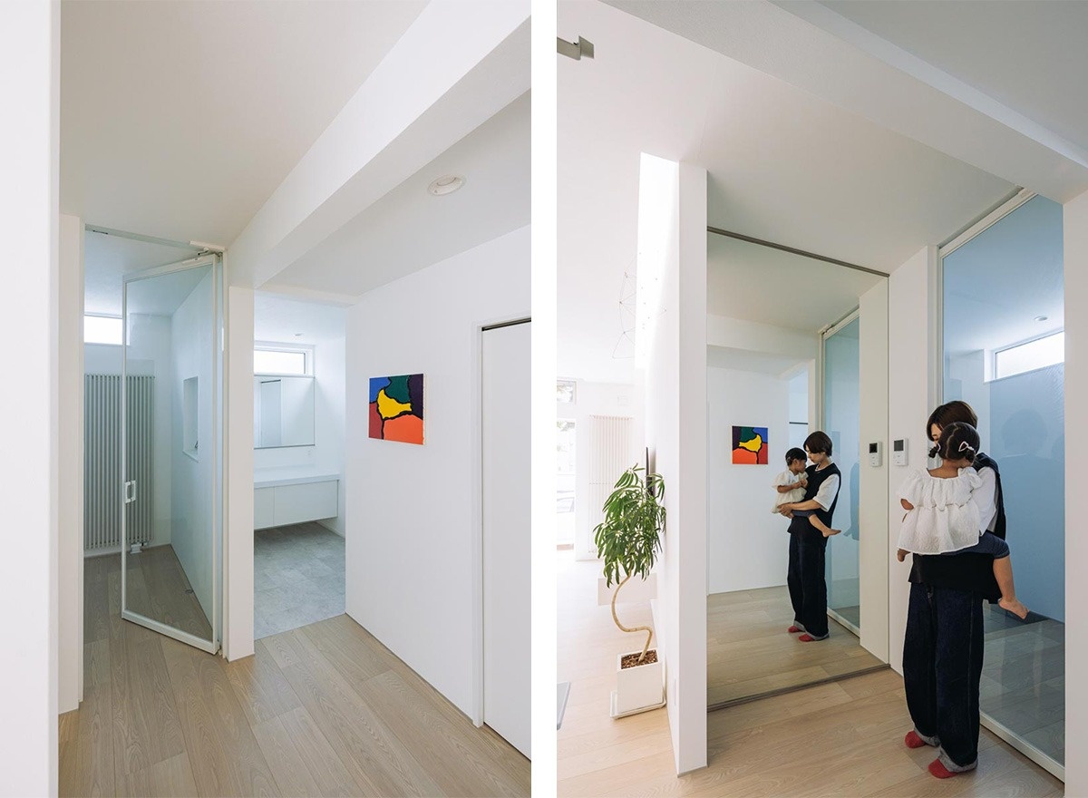 (写真右)玄関ホールからリビングに向かう場所に設置された、天井まで届く大きな鏡。「せっかくなら、と石井さんに提案してもらってこのサイズに。部屋を広く感じられる仕上がりで大満足です」