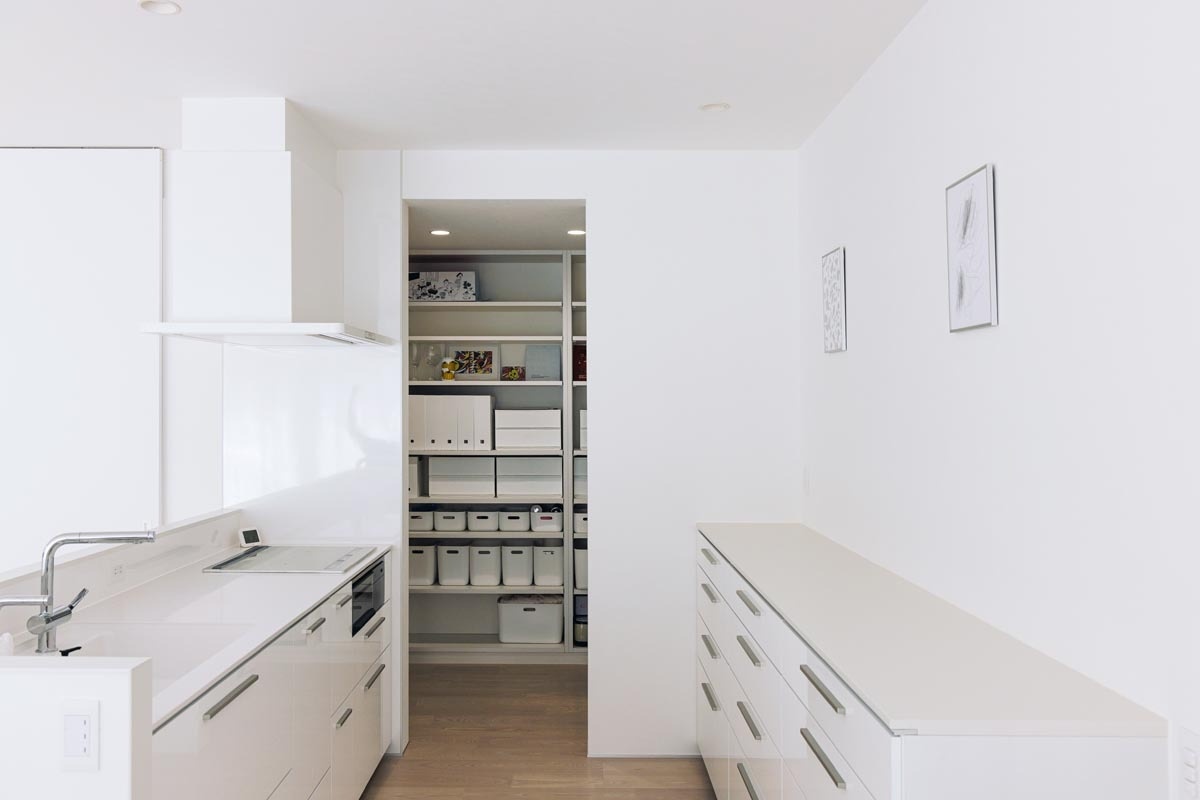 収納はすっきりと片付く引き出しタイプです。奥にはリビング収納も兼ねた大きなパントリーを設け、キッチン家電から各種書類までまとめて収納。生活感の少ないLDKを実現しました。