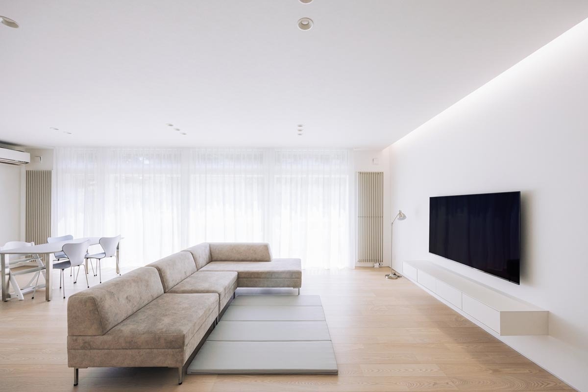 ほとんどのものが白で統一されている室内。「新婚旅行で海外に行ってから美術館めぐりが趣味になったんです。家づくりでも絵を飾った時の印象をイメージしながら、色づかいや空間の使い方を決めていきました」