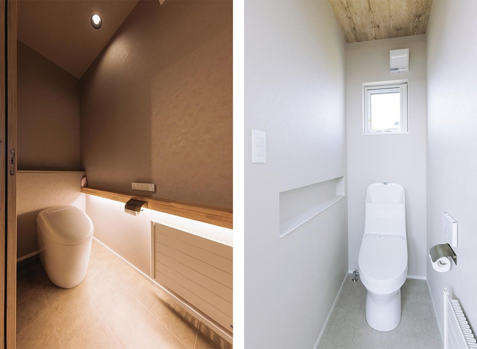 間接照明が落ち着く空間を作っている1階トイレ(写真左)。2階トイレ(写真右)はハニカム柄のクッションフロアをアクセントに。