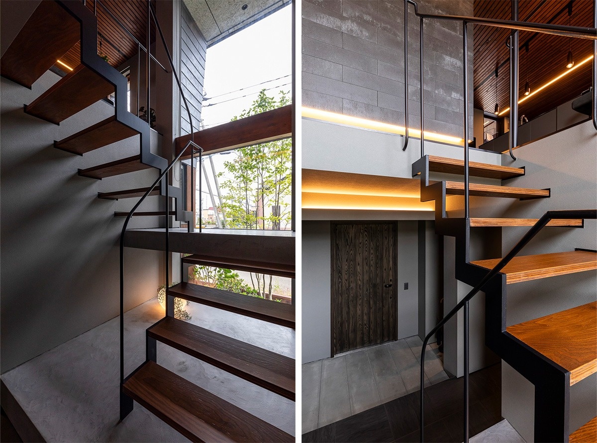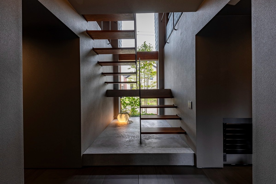 吹抜けの階段ホールに大開口部があるクールモダンなエントランス
