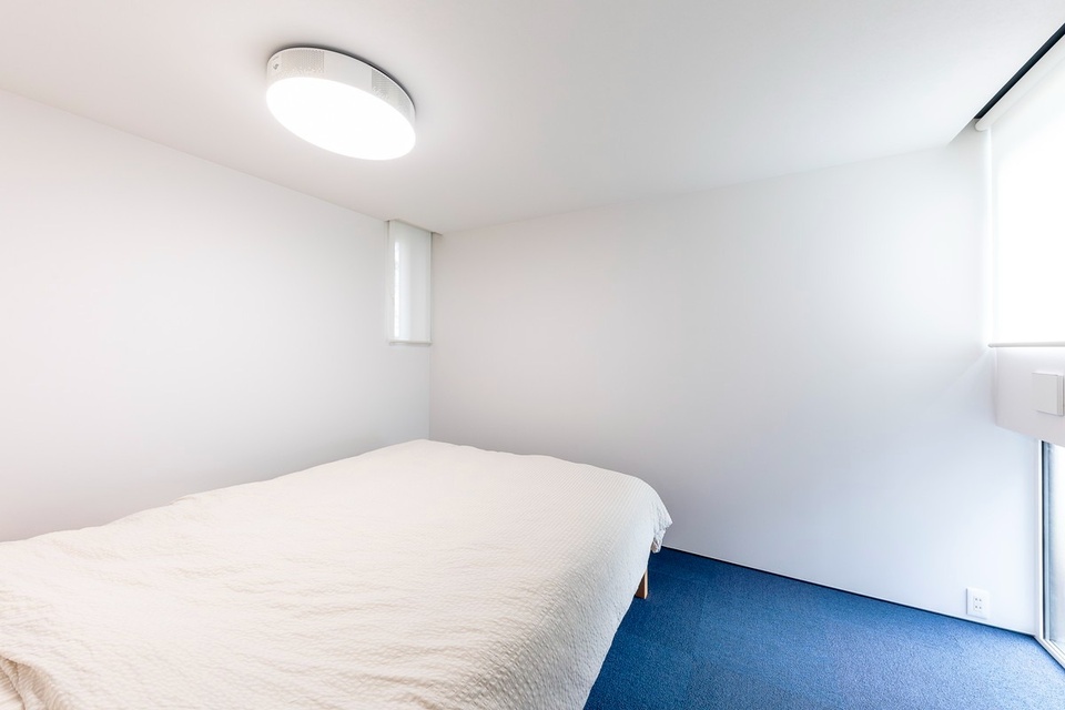 白とブルーのコントラストが美しい1階のベッドルーム。プロジェクター付きシーリングライトからの映像を投影する壁のみ、目の細かいクロスを使用しています。