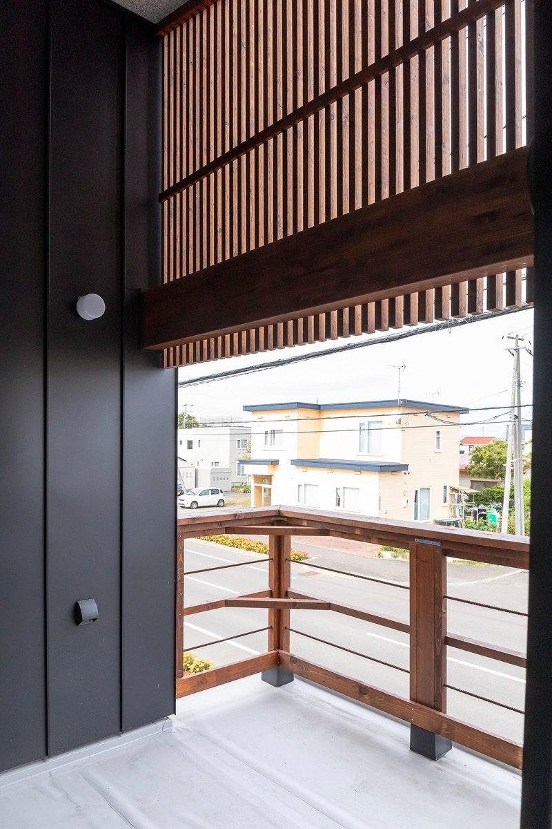 ルーバー状の日よけがお洒落なバルコニー。バーベキューや夕涼みが楽しめるセカンドリビング的な半屋外空間です。