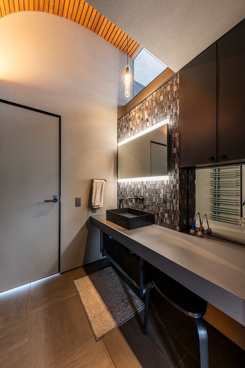 アールの吹き抜け天井が空間的な広がりを感じさせるホテルライクな洗面スペース。この天井にも胴縁を使っています。