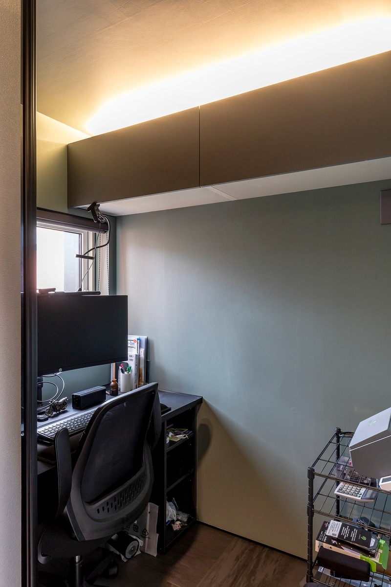 寝室の隣にあるご主人のワークスペースは窓際にカウンターを造作。出入り口正面の吊り戸棚はキッチンとセットだったものを有効活用しました。