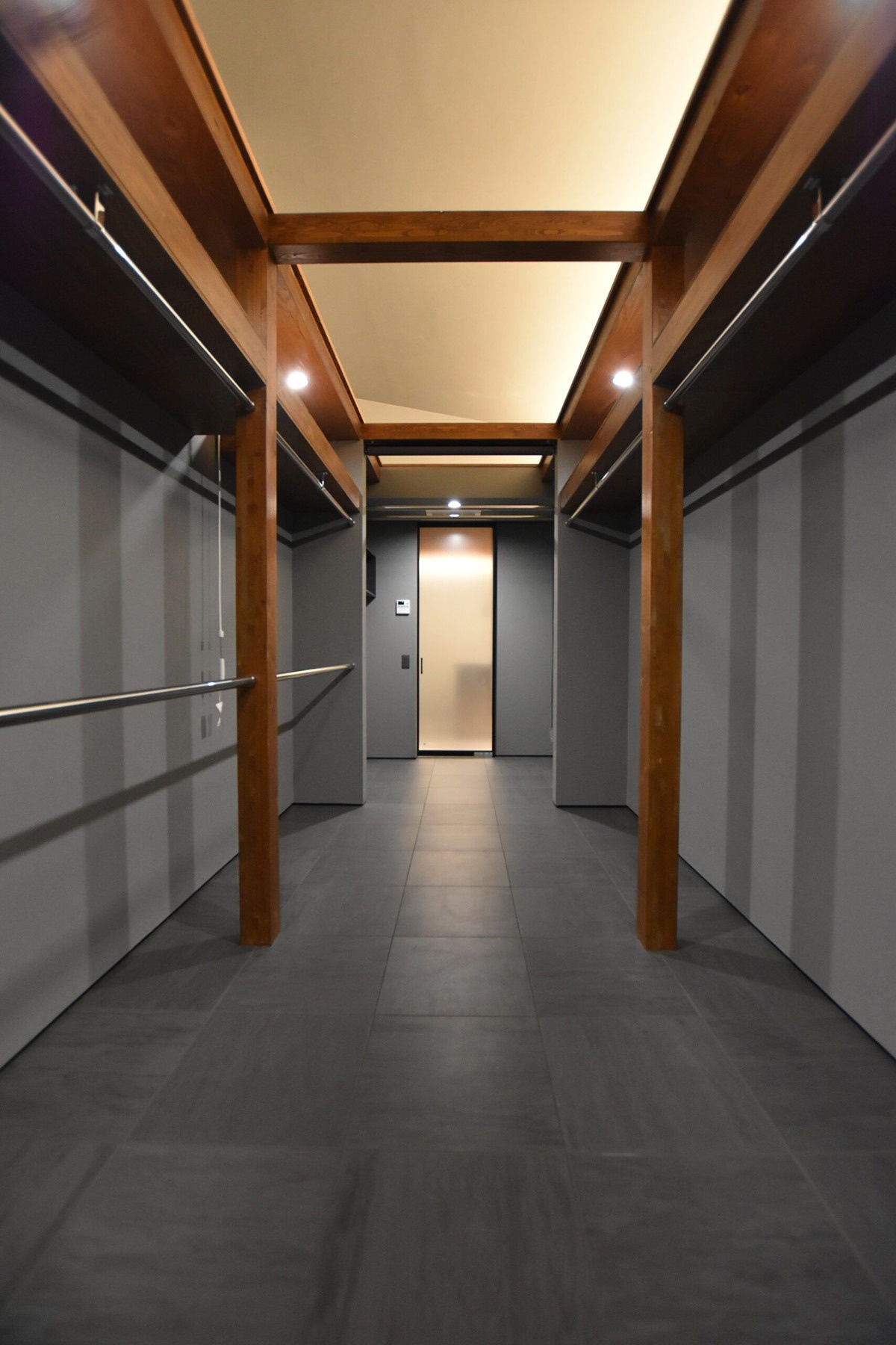 通路沿いの壁には、2階部分の外装にも使われているシングルスレート(SOLIDO)を貼り、間接照明をプラン。ラグジュアリーな空間に仕上がりました。