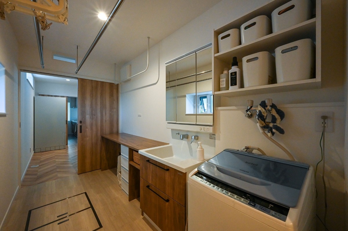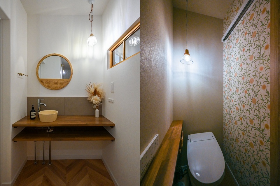 また、キッチン、ファミリークローク、洗面脱衣室、浴室が連続する動線によって、家事もラクラク。ファミリークロークと洗面脱衣室はスペースを広く取ることによって、家族4人分の衣類等の収納や洗濯物の室内干しも余裕で行えます。洗面脱衣室のカウンターも収納ケースやスツールのサイズに合わせ、すぐ横にある引戸と同系色で塗装して統一感を演出するなど造作ならではの仕上がりに。トイレもウィリアム・モリスの花柄クロスを引戸側の壁面に使い、ペンダント照明や木製カウンターとともにコーディネートしています。