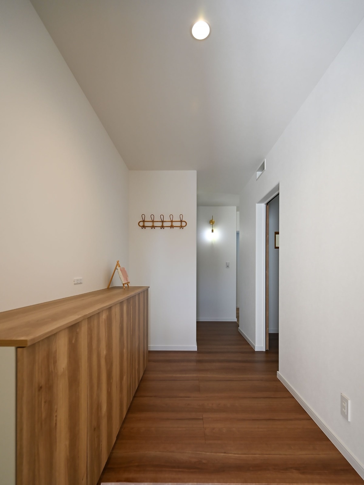 また、室内で目に入る色が白ばかりになると疲れてしまうのではないかという心配もあったそうで、その点はインスタグラムで気に入った画像などを光輝建設のコーディネーター・濱野霞さんと打ち合わせを重ねながら決めていったとのこと。「見せてもらったインスタグラムの画像を参考にして、パースを作りながらくすみカラーの白いクロスの中に、ブラウン系で木目柄の建具などを入れてカラーコーディネートを行い、全体的に統一感が出るようにしました」(光輝建設・濱野さん)。