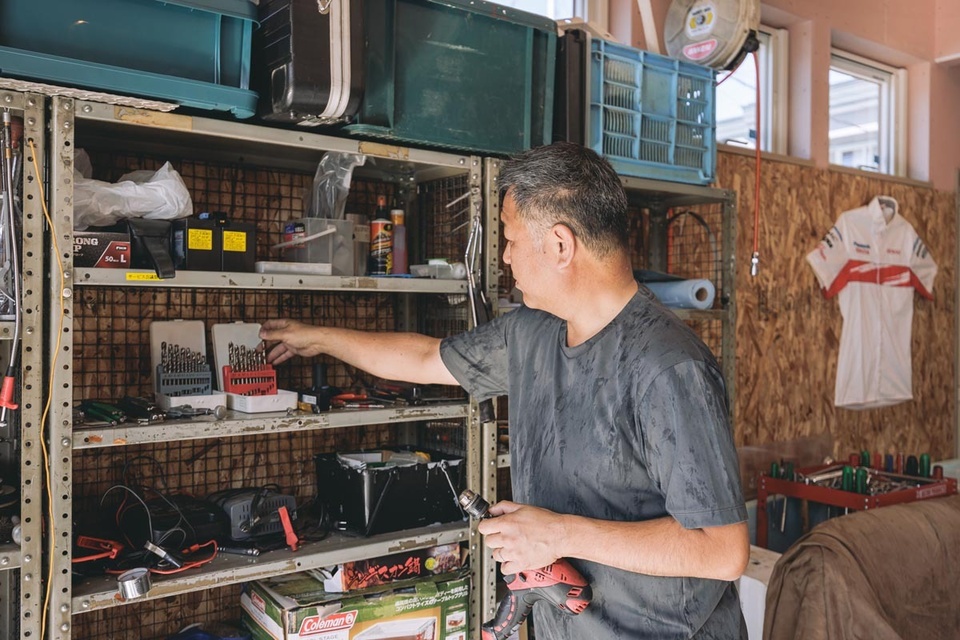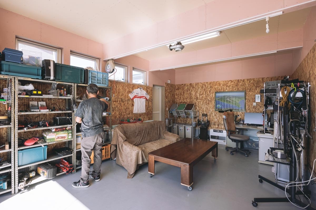 木工、鉄工など様々なDIYをこなすご主人。ガレージは車の整備やDIYの場として使うほか、パソコンやテーブルを置いて書斎や応接室としても利用しています。