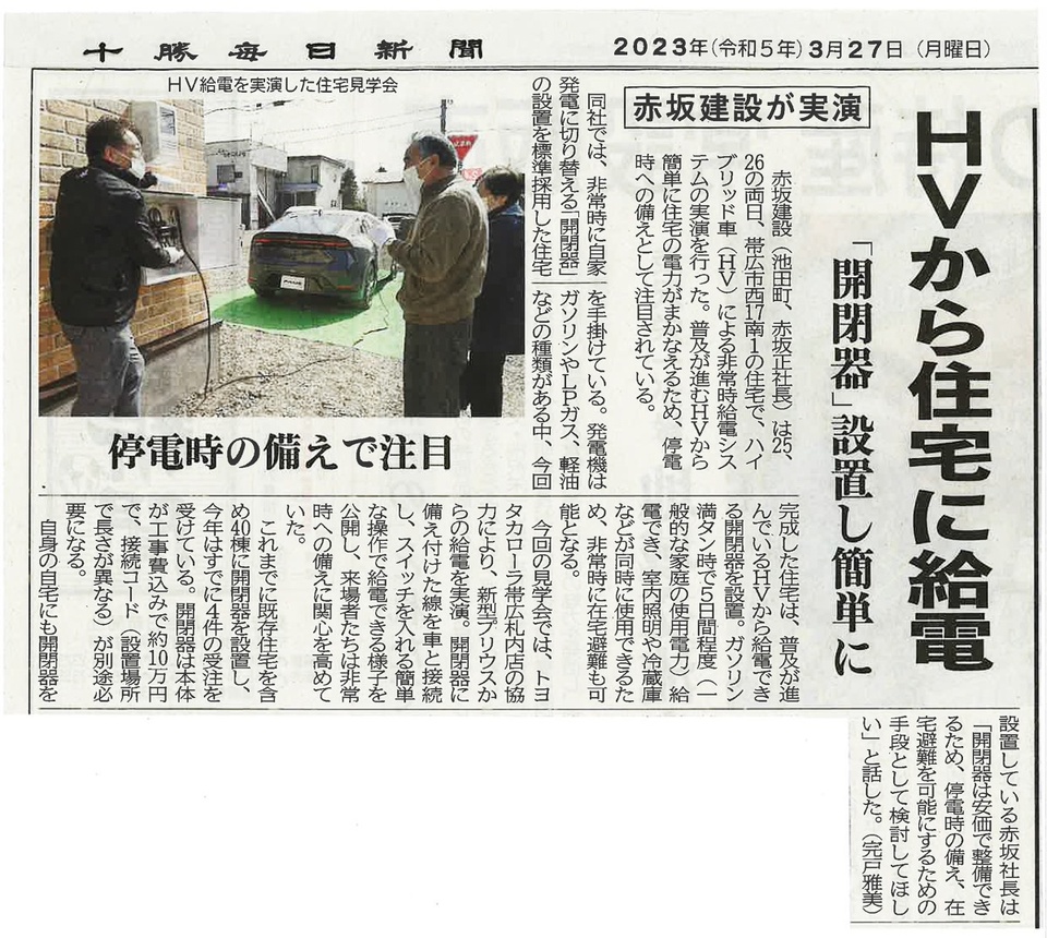 赤坂建設の家では、非常時に電源を自家発電へと切り替えるための「開閉器」の設置が標準仕様となっています。2023年3月に行われた住宅完成見学会ではこの給電システムを実演。2日間で35組もの見学者が訪れました。