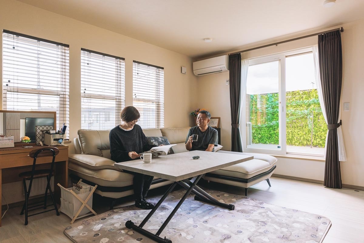 2階のリビングはルーフバルコニー付きです。「間取りはほぼ自分で考えたのですが、1階にガレージがあるのでLDKは自然と2階になりました。階段を上るのが大変では?という心配もありましたが、陽当たりがよく、カーテンを閉めなくても生活できる開放感があります」