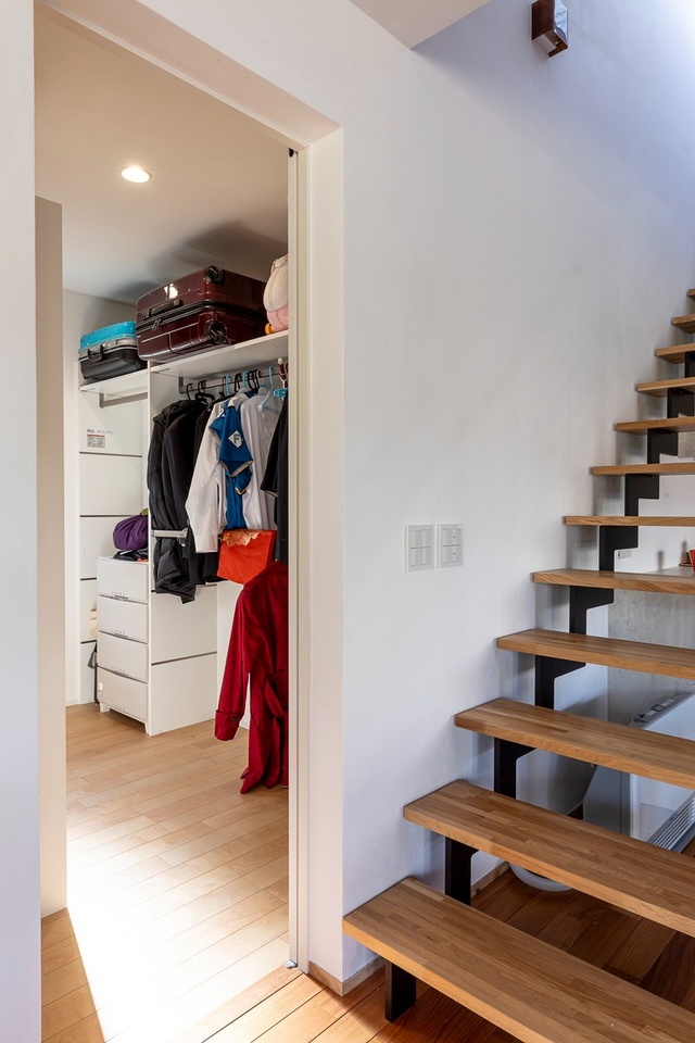 ファミリークローゼットにはリビングからも出入りができます。こまごまとしたモノや衣類であふれがちなパントリーや納戸、クローゼットがキッチン裏に直線で配置され、回遊できる動線が作られています。