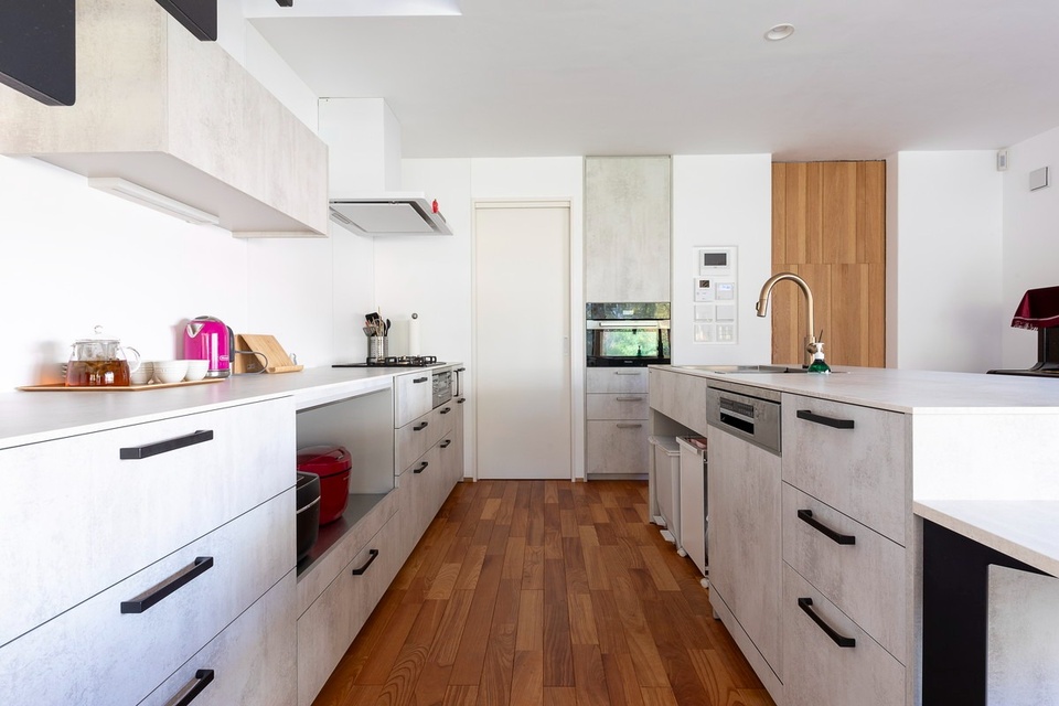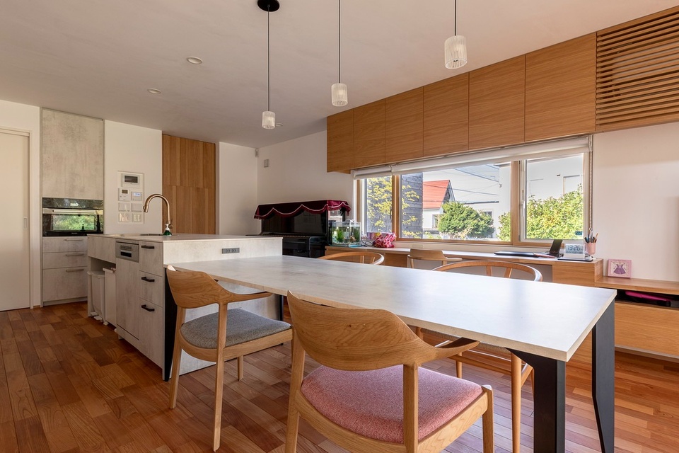 キッチンは、さまざまな組み合わせが楽しめるキッチンハウスのセミオーダータイプ。アイランド型でダイニングテーブルを横並びに配置し、調理から食卓までの動線がスムーズです。ダイニングテーブルもキッチンハウス製で統一感があります。