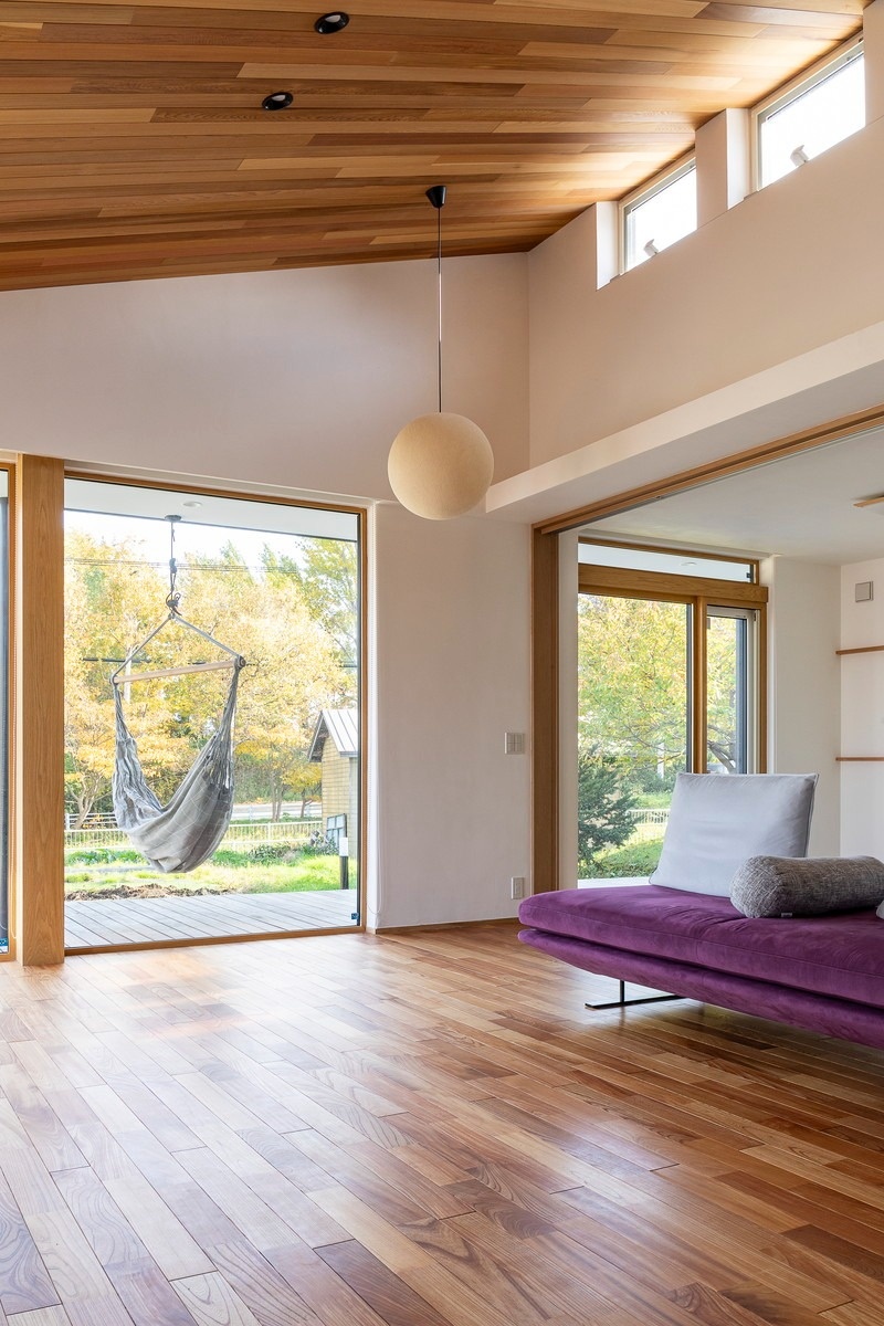 ご主人からは、外の景色が眺められるようガラス面を広くたくさん採りたいとの要望があり、ウッドデッキにつながる部分は全面ガラスにしました。まるで外と内がつながっているような開放感です。