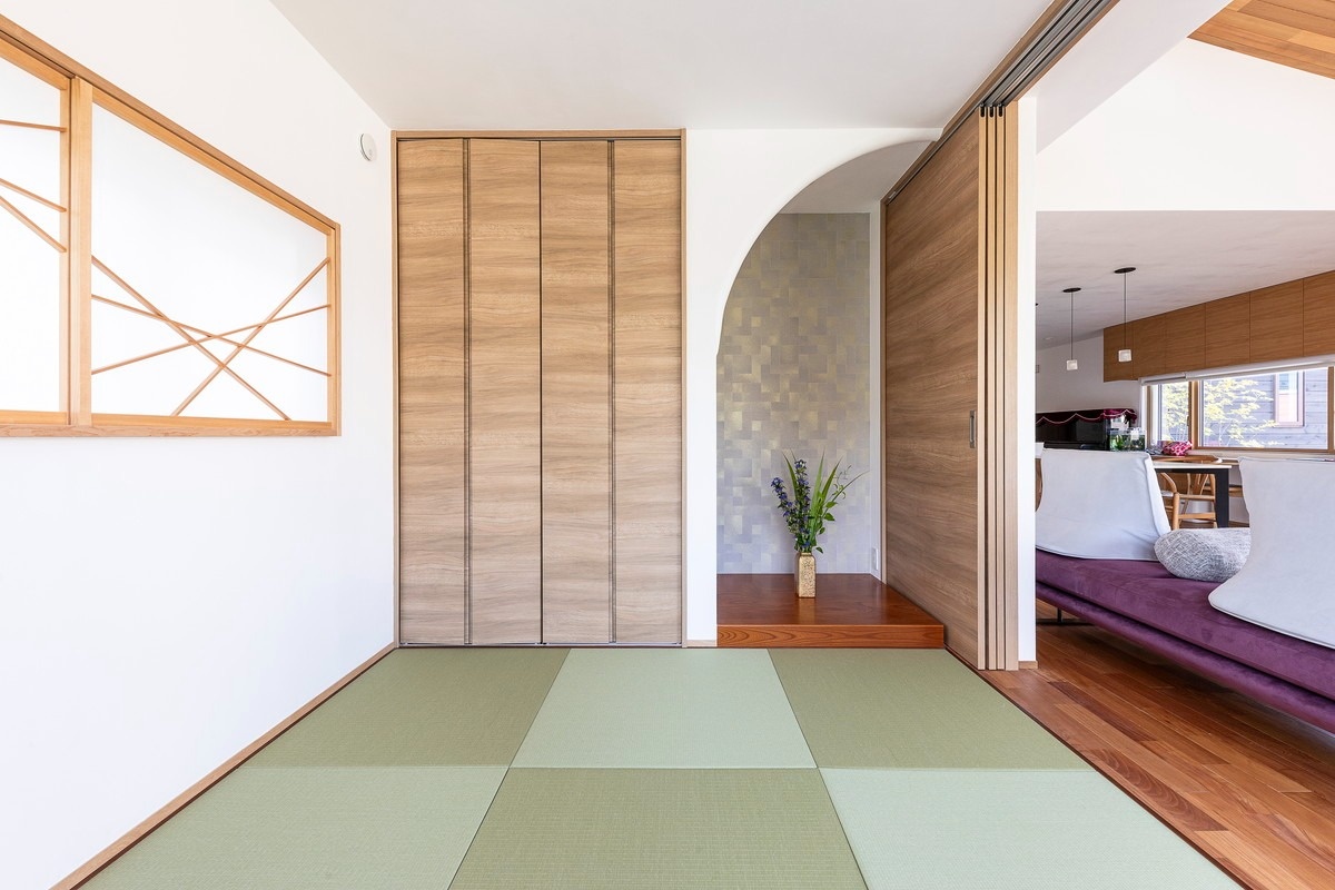 これまで本格和風住宅を数多く手がけてきた北渡建設だけに、和室も美しい佇まいです。弧を描いた下がり壁が印象的な床の間をはじめ、障子のデザインはオリジナルで、数パターン作って提案してくれたそうです。