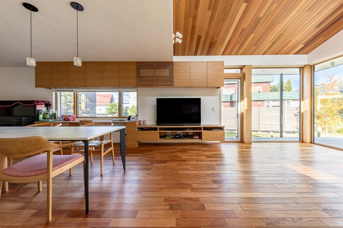 リビングのテレビボードや吊り戸棚は造作によるものです。エアコンはテレビ上部のルーバー内部に収めたため、見た目も美しく、すっきり。暑かった夏もエアコン1台で家じゅう涼しく快適だったそうです。