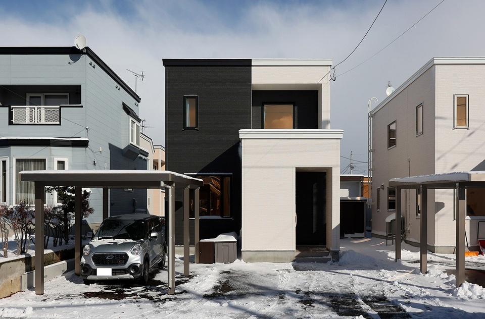 ブラックとホワイトのサイディングを使ったスタイリッシュな外観。建物前面は車2~3台分のスペースを確保。アスファルト舗装されており、カーポートも備えています。