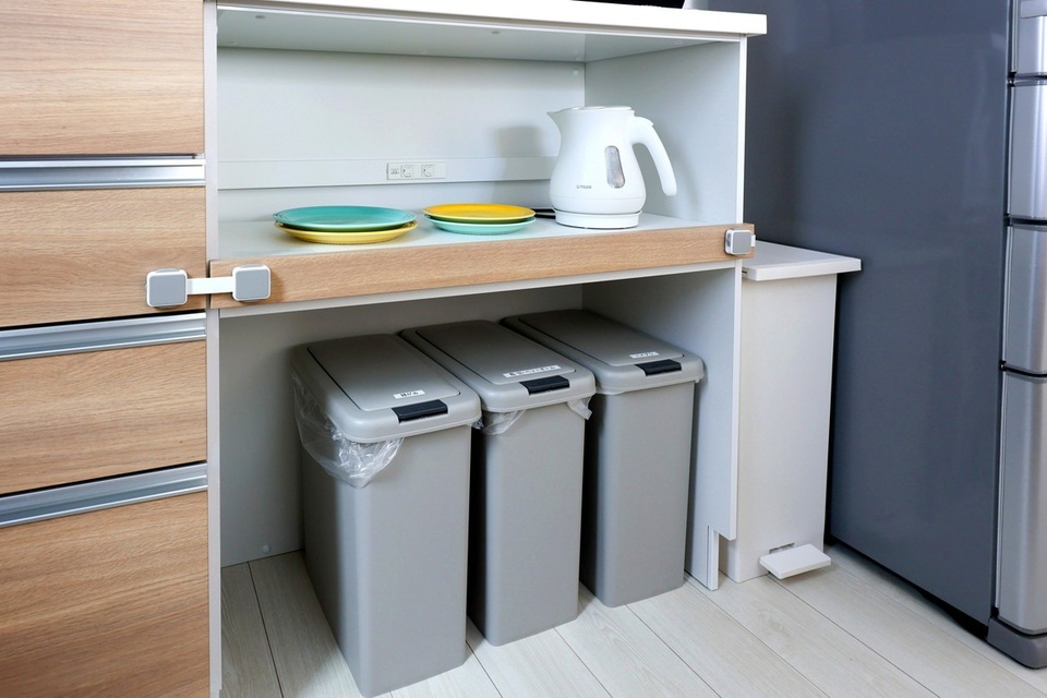 背面収納は作業がしやすいスライド式の天板付き。その下にはごみ箱がスッキリと収まっています。
