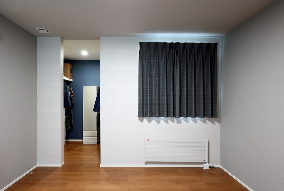 2.5帖のウォークイン・クローゼットを配した8帖の主寝室。ペールグレーのアクセントクロスに白いドアがポイントになっています。