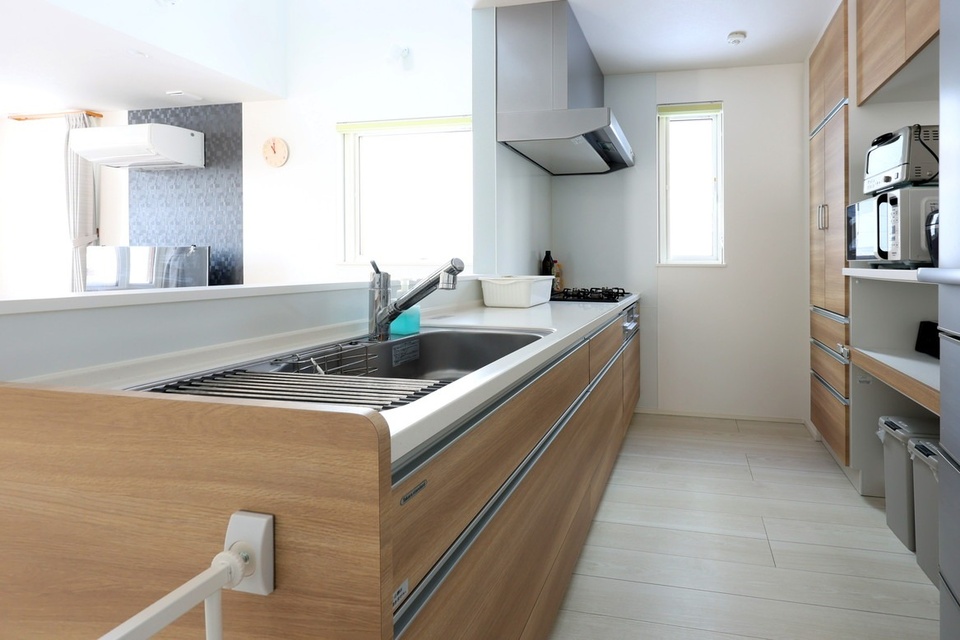 木目調の面材で統一されたシステムキッチンはタカラスタンダード製。使いやすく収納も充実しています。