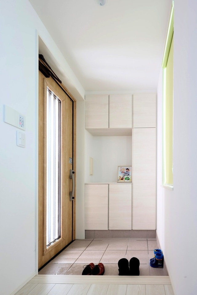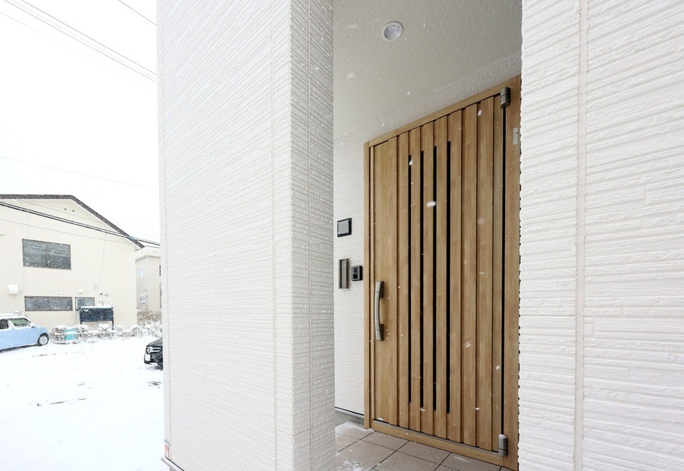 玄関は、雨や雪から守ってくれる屋根付きのポーチになっています。通りから直接見えないドアの配置で、プライバシーに配慮した設計です。