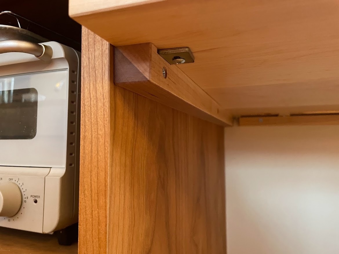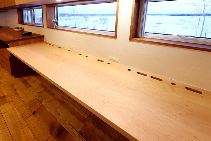 須田さんはその際(きわ)となる部分の桟(さん・カウンターを支える横木)も、2種類の木を組み合わせて作りました。「見えない所にもこだわりが感じられて、嬉しくなります」と奥さま。