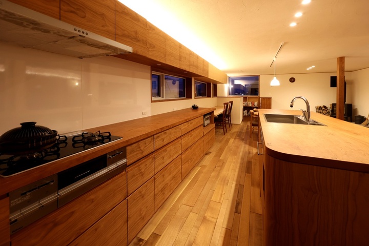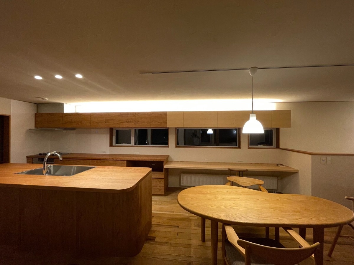 キッチンとダイニングの吊り戸が途中で色違いになっているのは、使っている素材が違うから。キッチン部分はチェリーを、ダイニングのカウンターテーブルとその上の吊り戸はカエデの木を使っています。