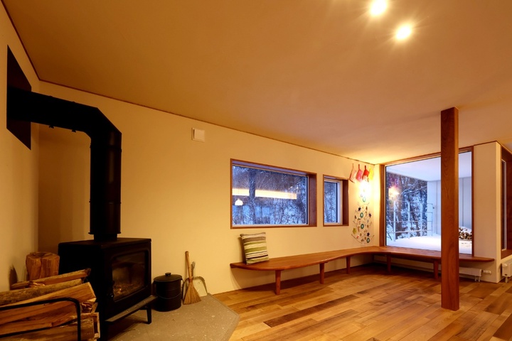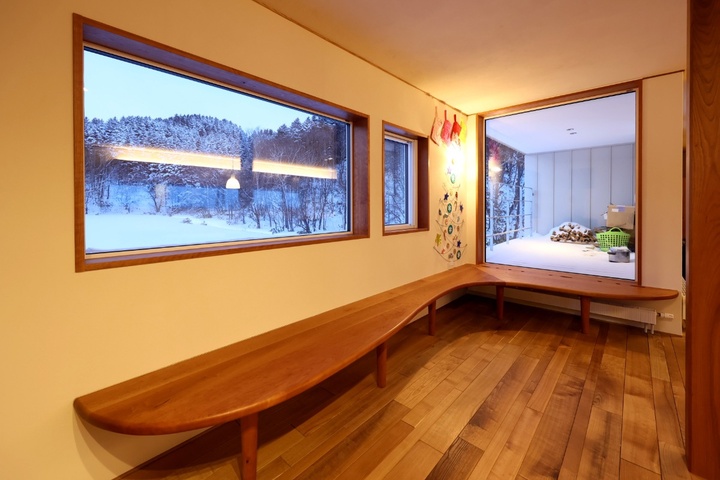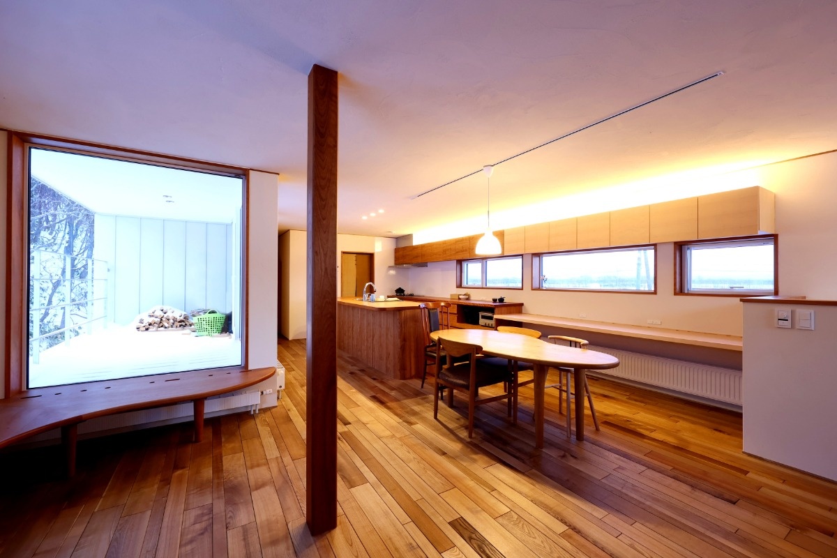 テラスと、雪原が眺められる大きな窓辺につくられたL字型ベンチ。ゆったりとした時間が流れます。
