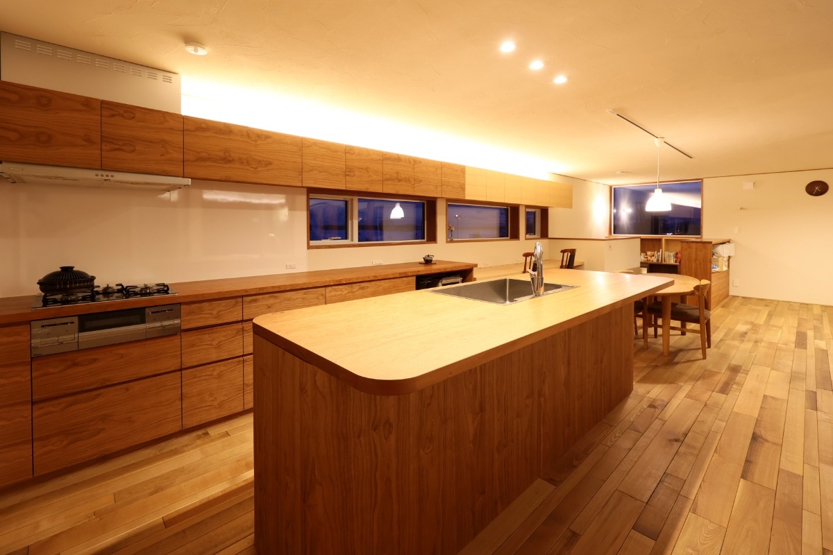 シンクとコンロを分けたⅡ型のキッチン。アイランドキッチンは、コーナーをラウンド型に仕上げた手の込んだ造りです。