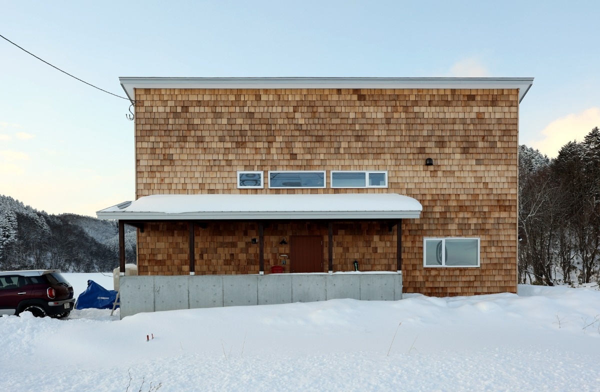 外壁にウェスタンレッドシダーのウッドシングル(細かな木板を張り合わせる手法)を使った素材感あふれる外観。長いカバードポーチは雪除けや日除けの役割も果たしています。