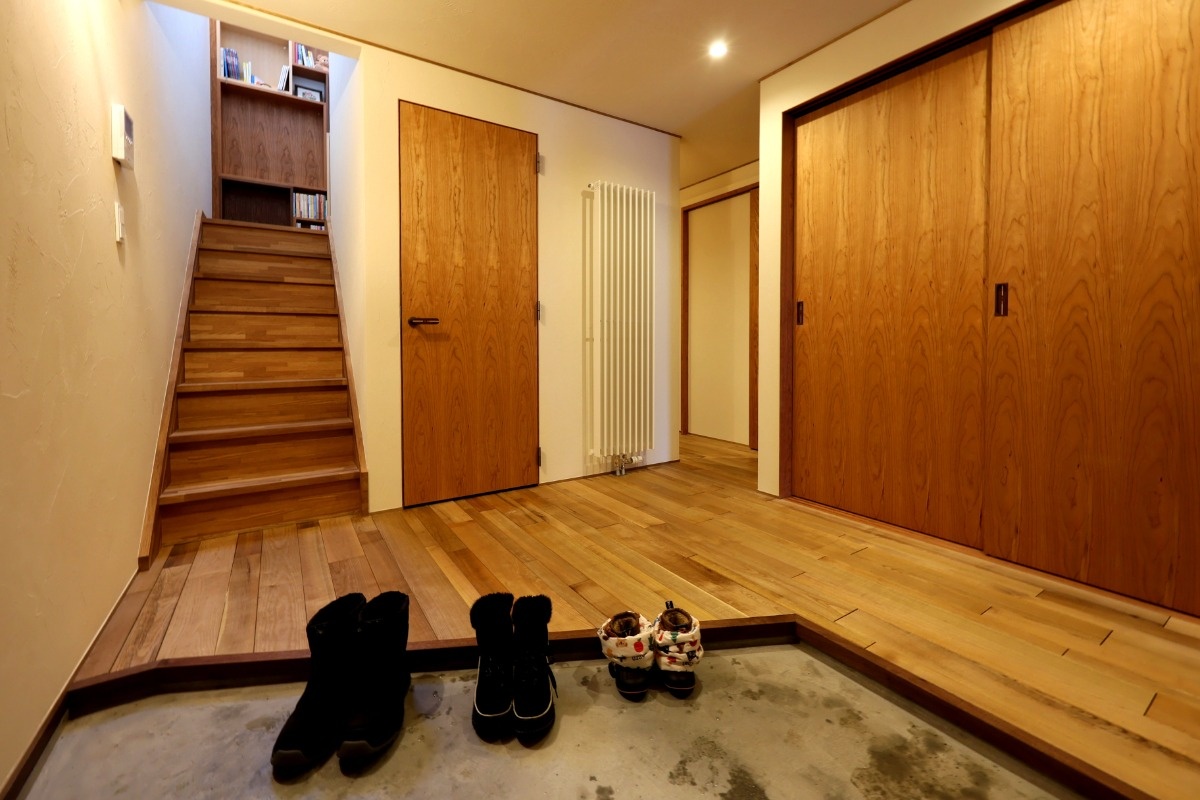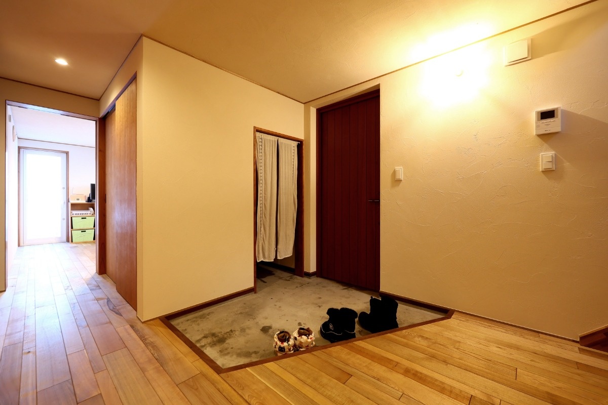 玄関ホールの左手には2階LDKに通じる中折れの階段が見えます。大きな引き戸収納の左手奥には、ユーティリティーと浴室が続いています。