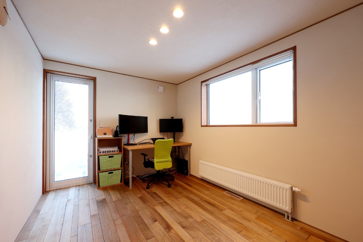 一部屋はご主人のテレワーク・スペースとして活用中。テラス窓から庭のデッキに出ることができます。