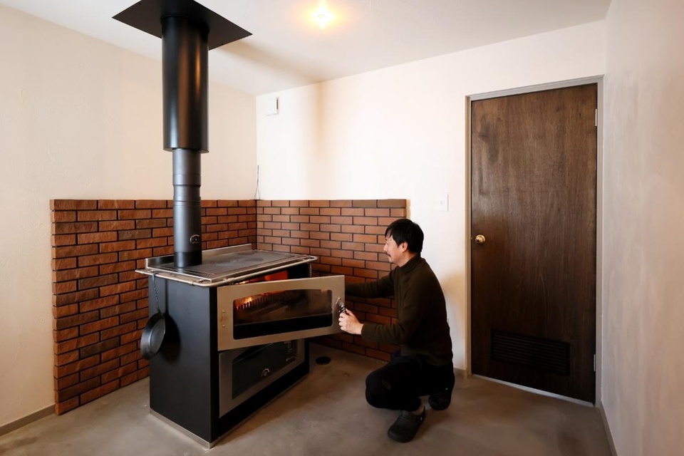薪小屋の隣にある勝手口から入ると、広い天板とオーブン機能で調理もできる、イタリア・デマニンコア社のクッキングストーブ『ドミノ』がありました。壁には、耐熱用に江別レンガを採用しています。