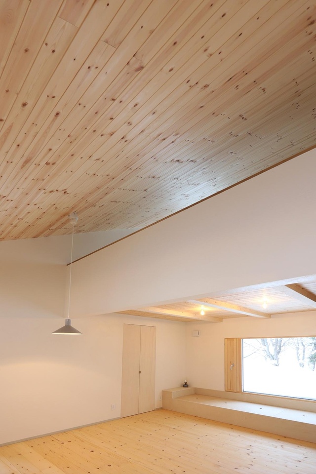 片流れ屋根なので、2階の居室は天井が屋根なりに傾斜になっています。床材と同じくトドマツの板張りで、屋根裏部屋の楽しさを感じます。針葉樹の床材は柔らかく、足裏の感触が心地よいのが特徴です。