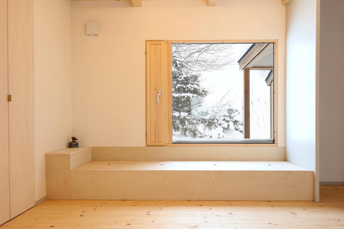 窓際には、収納を兼ねたソファーベッドを造作。窓の向こうの桜の木は、暖かくなると春の訪れを知らせてくれます。晴れた日には旭岳も見られ、四季折々の景色を楽しめる空間です。