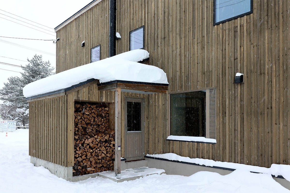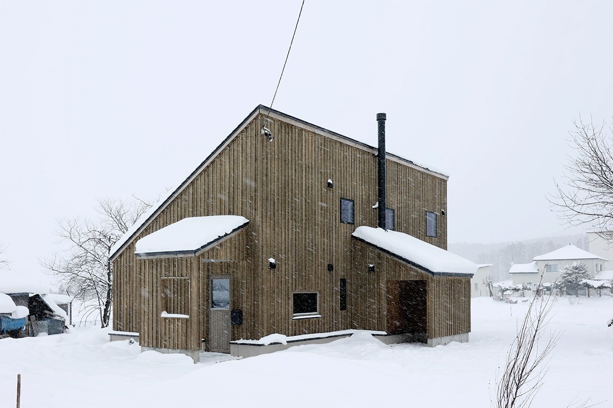 クリスマスイヴの日、萬田さんが東京から完成直後の新居を訪れると聞き、取材にお邪魔しました。外壁は全面、道産トドマツの板張り。北海道らしいモノクロームの世界によく似合います。