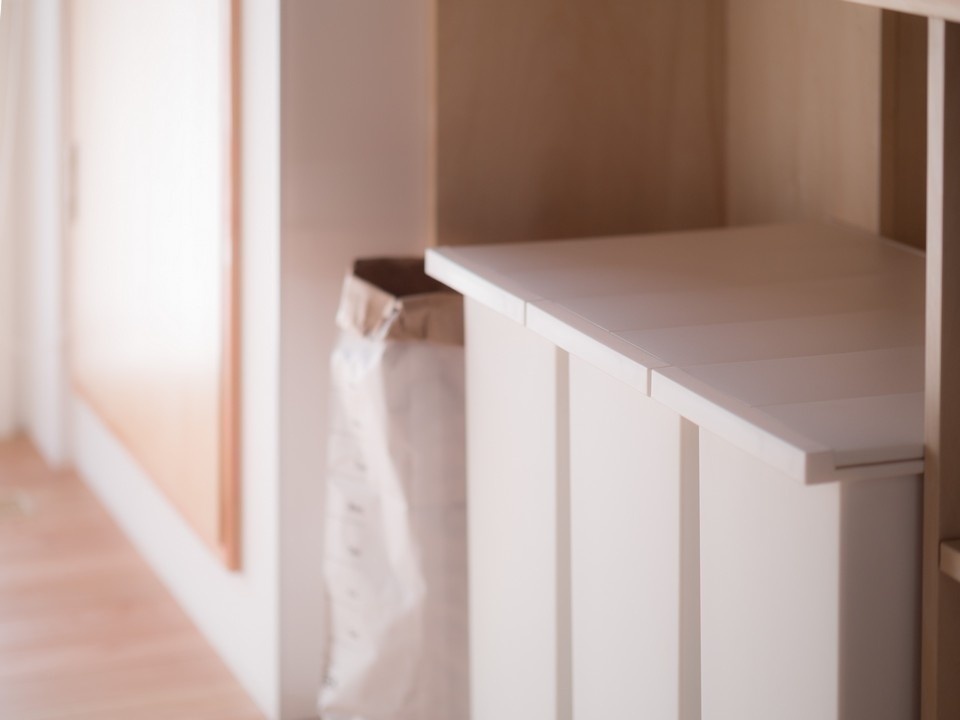 造作したカウンターの下には、すっきりしたデザインのゴミ箱を設置。フタが2つに割れて開くの商品を選んだ。奥には、食品庫がある