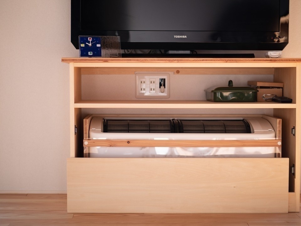 テレビ台に組み込まれた、寒冷地向けエアコン。基礎断熱された床下空間に向かって暖気が吹き出し、床にある通気ガラリから暖気がのぼって部屋中を暖房できる