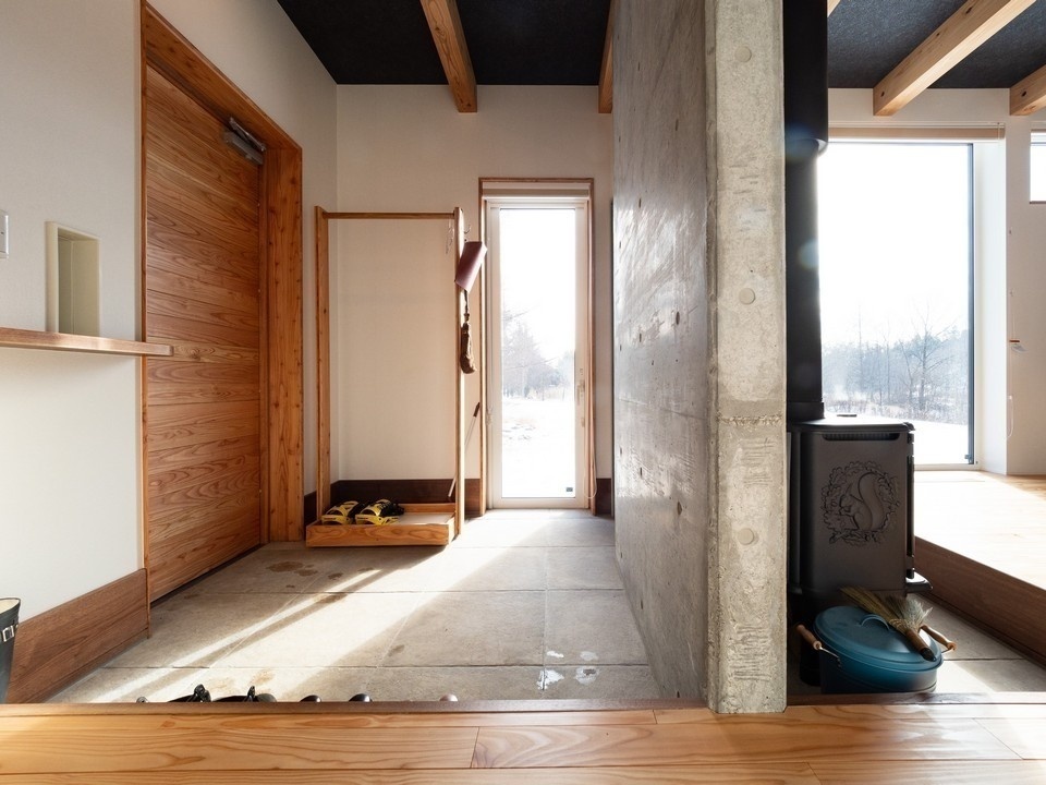 ウッディな木製玄関ドアを開けて入ると、正面右手にコンクリートの壁が見えます。左手には天井まで届く大きなドア。ドアの表面には、なんと天井と同じダークグレーの壁紙が貼られています。Kさんご夫婦の若い感覚を生かし、自然素材を使った家にモダンな意匠を採り入れました。